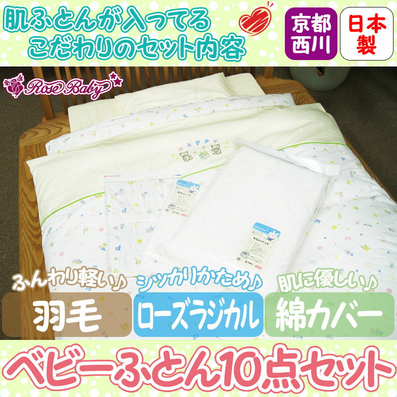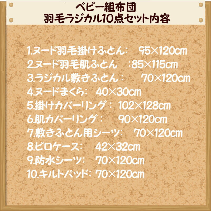 ◆メーカー:京都西川 ◆商品お問合せ番号:by-7021R 羽毛ハッピートイボックス10 ●商品内容:ローズベビーラジカル組布団 羽毛HTB10点セット ○掛カバーリング×1枚 ■サイズ:102×128cm ■組成:綿100% ○肌カバーリング×1枚 ■サイズ:90×120cm ■組成:綿100% ○ヌード羽毛掛けふとん×1枚 ■サイズ:95×120cm ■組成:ふとんがわ-ポリエステル80%/綿20% 詰めもの-ダウン90%/フェザー10% 詰めもの重量-0.3kg ○ヌード羽毛肌ふとん×1枚 ■サイズ:85×115cm ■組成:ふとんがわ-ポリエステル80%/綿20% 詰めもの-ダウン90%/フェザー10% 詰めもの重量-0.1kg ○ラジカル敷きふとん×1枚 ■サイズ:70×120cm ■組成:ふとんがわ-綿100% 詰めもの-ポリエステル100% 詰めもの重量-2.2kg ○敷きふとん用シーツ:×1枚 ■サイズ:70×120cm ■組成:綿100% ○ヌードまくら×1個 サイズ:40×30cm 組成:側地 ポリエステル65% 綿35% 詰めもの ポリエステル100% ○ピロケース(無地):×1枚 ■サイズ:42×32cm ■組成:綿100% ○キルトパッド×1枚 ■サイズ:70×120cm ■組成:表地-パイル/綿100% 基布/ポリエステル100% 裏地-綿100% 詰めもの-ポリエステル100% ○防水シーツ×1枚 ■サイズ:70×120cm ■組成:表面-パイル/綿100% 基布/ポリエステル100% 裏面-ポリウレタンラミネート ◆備考:※掛・肌カバーリングは、それぞれにセッティングしています ■日本製 ◎商品説明 羽毛ふとんは、ふんわり軽く、とっても暖かいのが魅力♪